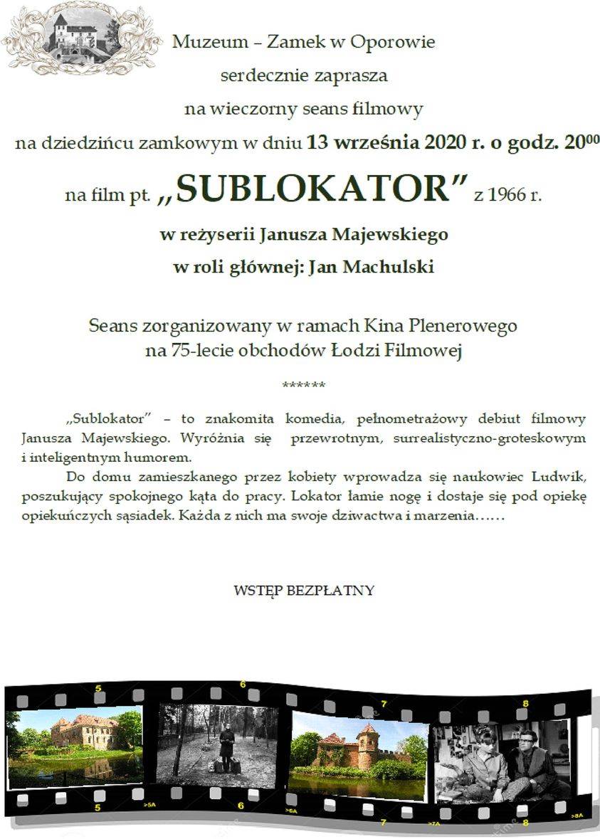 Muzeum – Zamek w Oporowie serdecznie zaprasza na wieczorny seans filmowy na dziedzińcu zamkowym, który odbędzie się w niedzielę, 13 września o godz. 20.00. Zostanie wyświetlony film pt. „SUBLOKATOR" z 1966 r. w reżyserii Janusza Majewskiego w roli głównej: Jan Machulski.