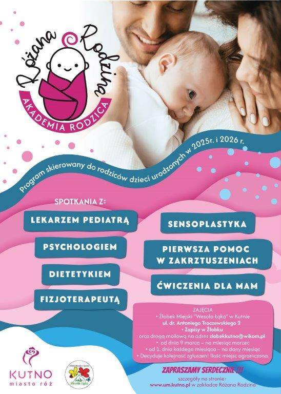 Rodzice dzieci urodzonych w latach 2025–2026 będą mogli wziąć udział w cyklu bezpłatnych spotkań edukacyjnych w ramach wiosennej edycji Akademii Rodzica. Zajęcia odbędą się w Żłobku Miejskim „Wesoła Łąka" w Kutnie i potrwają od marca do czerwca. W programie znalazły się spotkania ze specjalistami z zakresu pediatrii, fizjoterapii, dietetyki, psychologii oraz pierwszej pomocy.