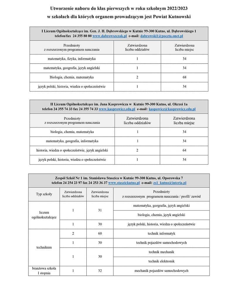W poniedziałek, 18 lipca, na podstawie wcześniej opracowanej oferty edukacyjnej oraz w oparciu o profilowanie się kandydatów w systemie do klas pierwszych, utworzono aż 33 oddziały i zakwalifikowano aż 1012 uczniów do szkół ponadpodstawowych w powiecie kutnowskim.