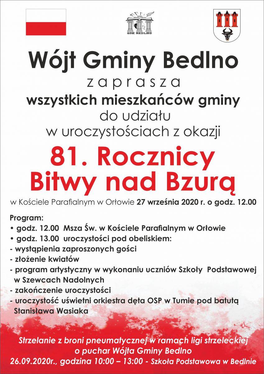 Wójt Gminy Bedlno, Gminny Ośrodek Kultury w Bedlnie zaprasza na zawody strzeleckie z broni pneumatycznej o puchar Wójta Gminy Bedlno w szkole podstawowej w Bedlnie w dniu 26.09.2020r., godzina 10:00 oraz na obchody 81 Rocznicy Bitwy nad Bzurą w Orłowie w dniu 27.09.2020r., początek godzina 12:00