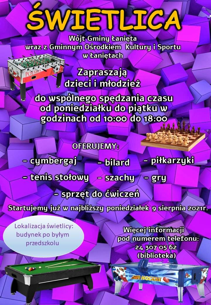 Wójt Gminy Łanięta wraz z Gminnym Ośrodkiem Kultury i Sportu zapraszają serdecznie do świetlicy w Łaniętach (budynek po byłym przedszkolu), w której już od 9 sierpnia będzie można wspólnie spędzić czas i korzystać z wyposażenia świetlicy.