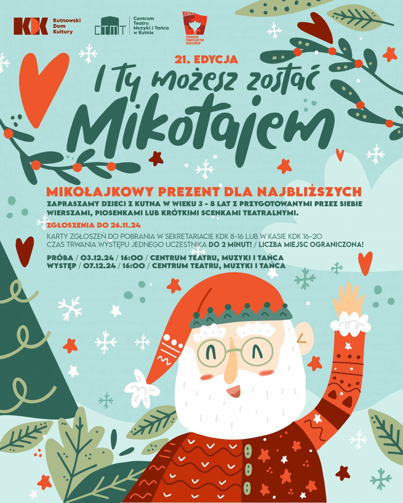 - Zapraszamy dzieci z Kutna i Powiatu Kutnowskiego w wieku od 3 do 8 lat z przygotowanymi przez siebie wierszami lub piosenkami. Zgłoszenia do 26 listopada 2024. Karty zgłoszeń do pobrania w sekretariacie KDK 8-16 lub w kasie KDK 16-20. Czas trwania występu jednego uczestnika do 2 minut! Ilość miejsc ograniczona! - mówią organizatorzy.