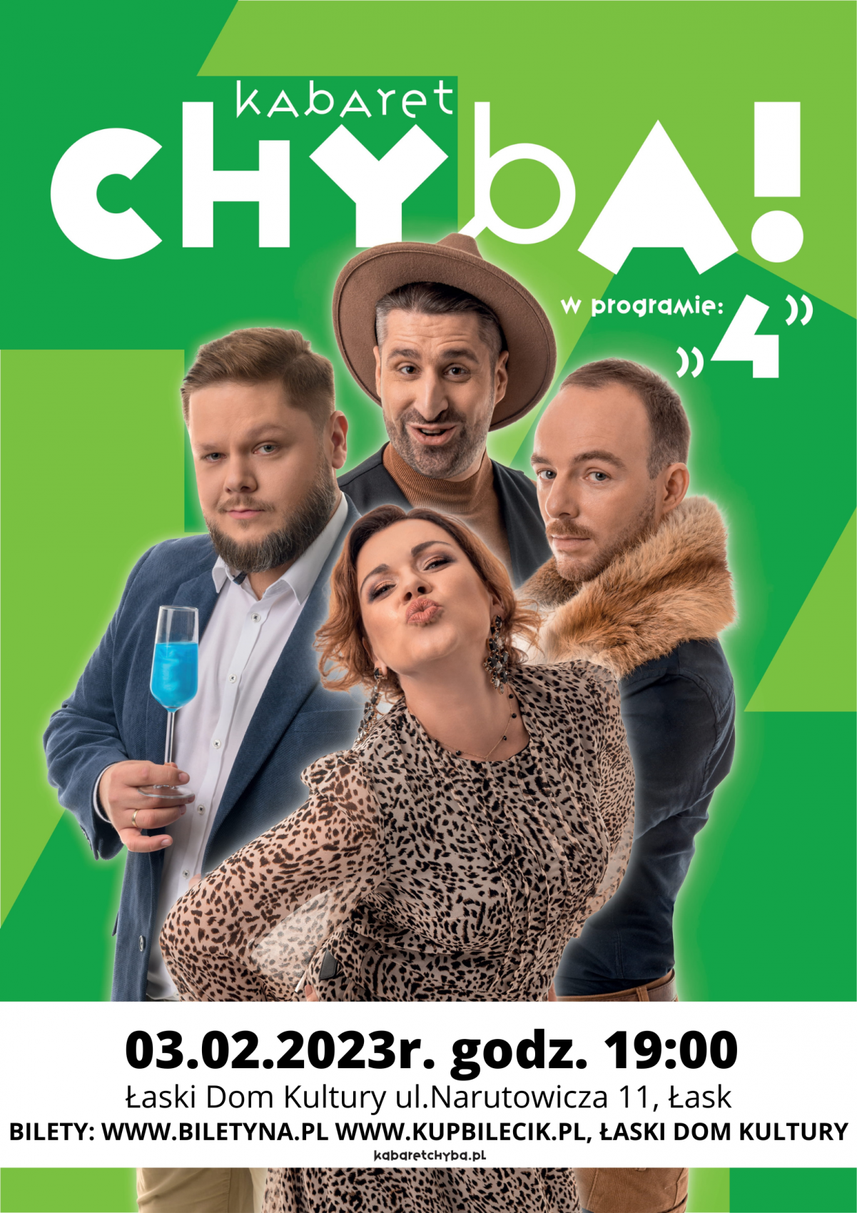 Występ odbędzie się w piątek (3 lutego) w Łaskim Domu Kultury przy ul. Narutowicza 11. Początek zaplanowano na godzinę 19:00. Bilety można zakupić tutaj: https://biletyna.pl/event/view/id/286685 oraz https://www.kupbilecik.pl/imprezy/85250/%C5%81ask/Kabaret+Chyba/.