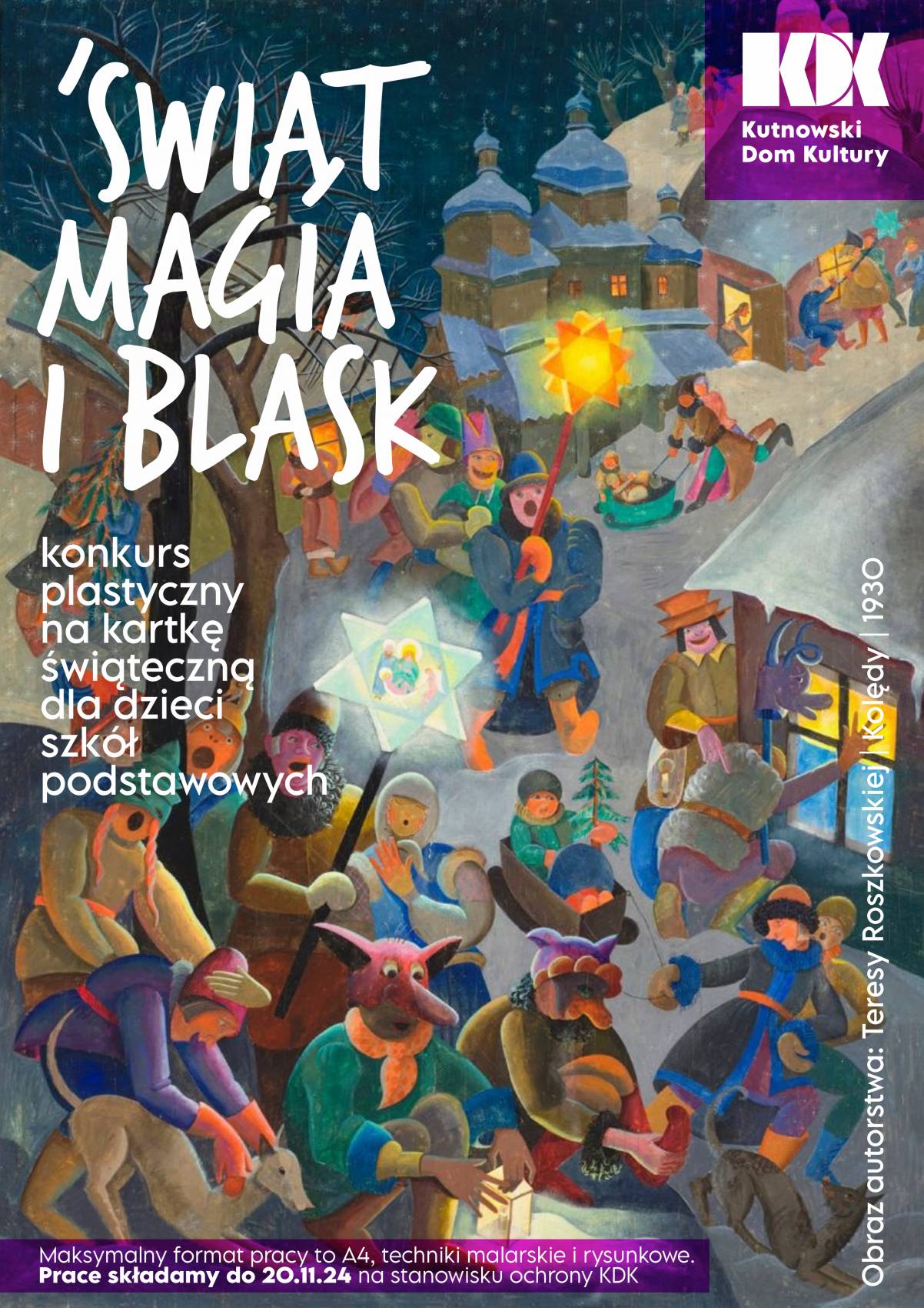 Kutnowski Dom Kultury zachęca uczniów szkół podstawowych do wzięcia udziału w konkursie plastycznym na kartkę świąteczną pod tytułem „Świąt magia i blask". Celem konkursu jest rozwój umiejętności plastycznych wśród dzieci.