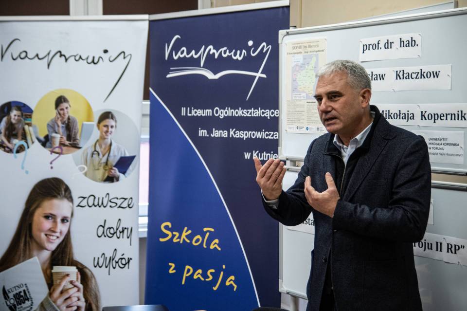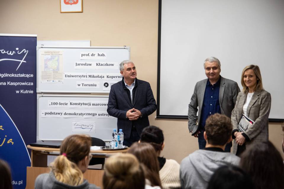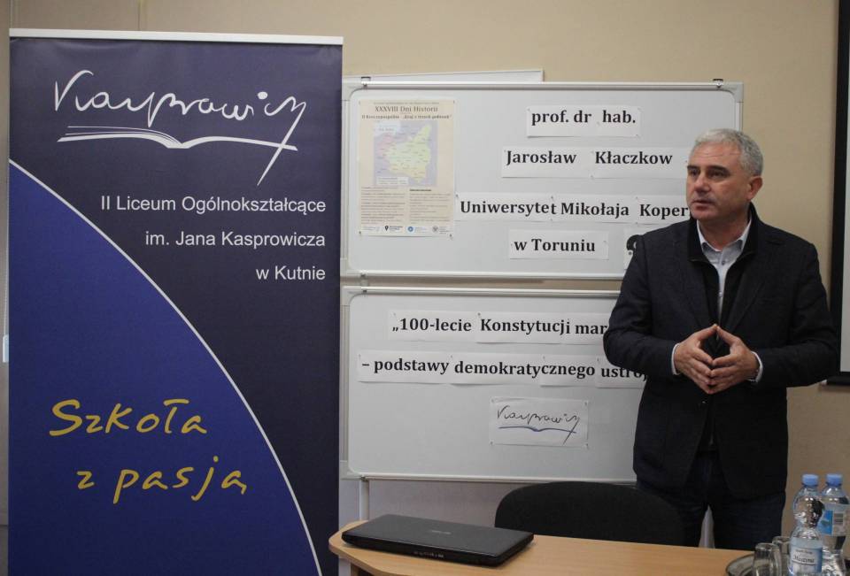 18 listopada szkołę odwiedził prof. dr hab. Jarosław Kłaczkow z Instytutu Historii i Archiwistyki Uniwersytetu Mikołaja Kopernika w Toruniu, ceniony autor wielu licealnych podręczników z serii Poznać przeszłość i Zrozumieć przeszłość. Tym razem młodzież miała okazję wysłuchać go osobiście. Profesor wygłosił wykład „100 – lecie Konstytucji marcowej". W bardzo komunikatywny, barwny i ciekawy sposób przedstawił genezę polskiej państwowości po rozbiorach i drogę do ukształtowania ustroju II RP. Wyczerpująco odpowiadał również na pytania młodzieży.