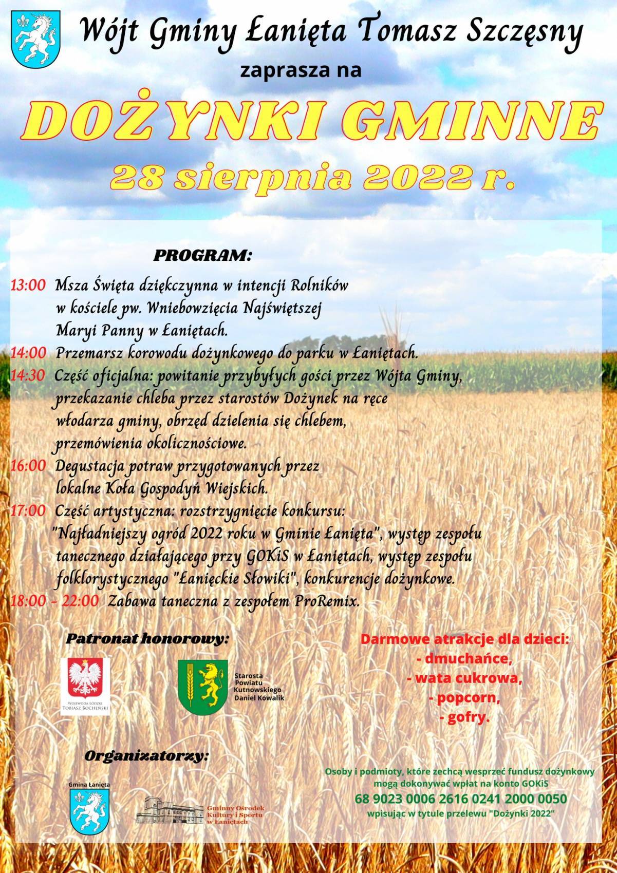 Wójt Gminy Łanięta Tomasz Szczęsny serdecznie zaprasza na Dożynki Gminne, które odbędą się 28 sierpnia 2022 r. w parku w Łaniętach.