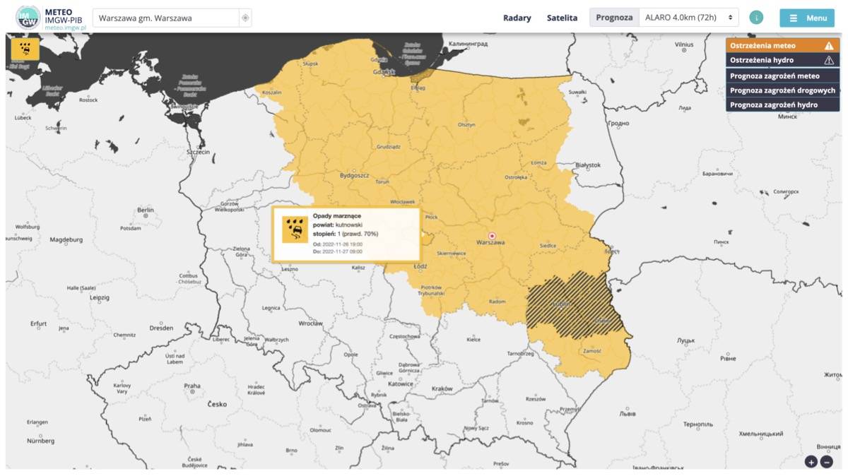 Żółty alert obowiązuje od soboty, 26 listopada od godziny 19.00 do niedzielnego poranka.Wyjątkowo niebezpiecznie może być nawet do 9.00 rano.