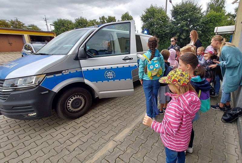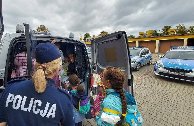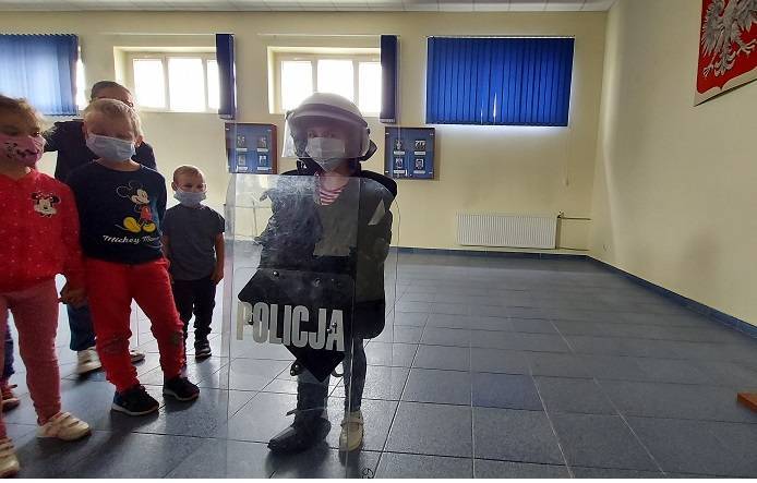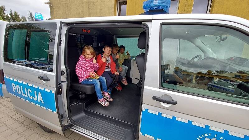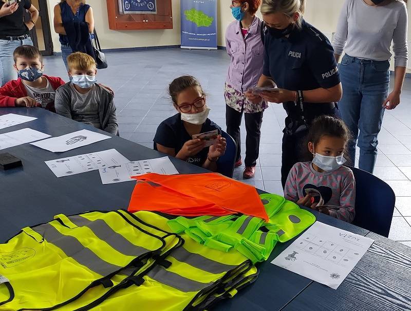 Następnie milusińscy udali się do sali odpraw, gdzie czekały na nich kolejne niespodzianki. Najmłodsi mogli między innymi przymierzyć sprzęt, który na co dzień policjanci używają w służbie, mogły również pobawić się w robienie odcisków palców. Podczas spotkania nie zabrakło rozmów o bezpieczeństwie podczas spędzania czasu wolnego w wakacje. Najmłodsi zadawali wiele pytań wskazujących na duże zainteresowanie pracą policjantów. Na zakończenie każde dziecko otrzymało niespodzianki książeczki mówiące o podstawowych zasadach bezpieczeństwa oraz elementy odblaskowe.