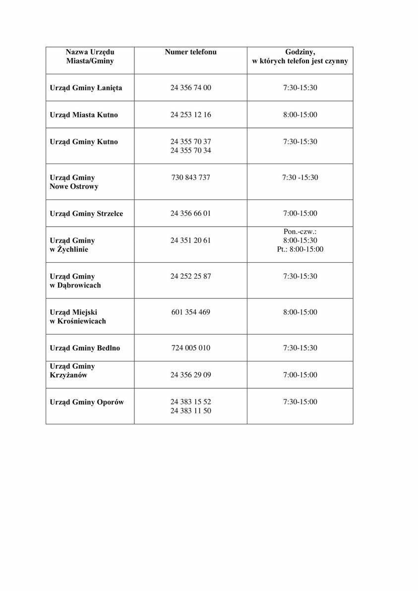 Poniżej znajduje się wykaz numerów telefonów do poszczególnych gmin, pod którymi można uzyskać informacje w zakresie transportu osób: