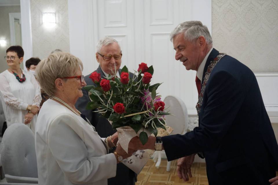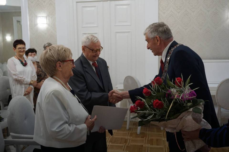 Z tej okazji Prezydent Zbigniew Burzyński Dostojnym Jubilatom przekazał serdeczne gratulacje oraz okolicznościowy dyplom z podarunkiem różanym. W słowach skierowanych do czcigodnych Jubilatów pogratulował wspólnie spędzonych lat oraz podziękował za zaangażowanie w życie społeczne miasta, a także wspaniały przykład do naśladowania dla wszystkich młodych ludzi.