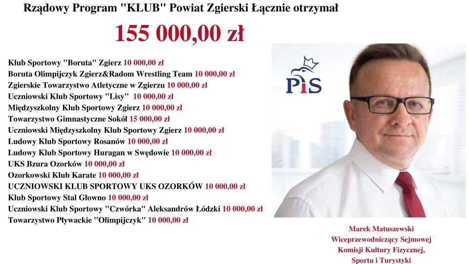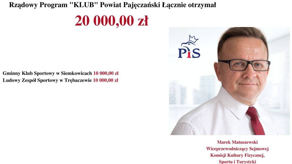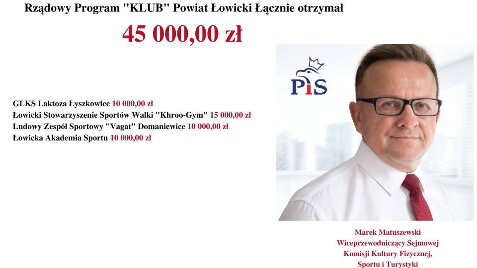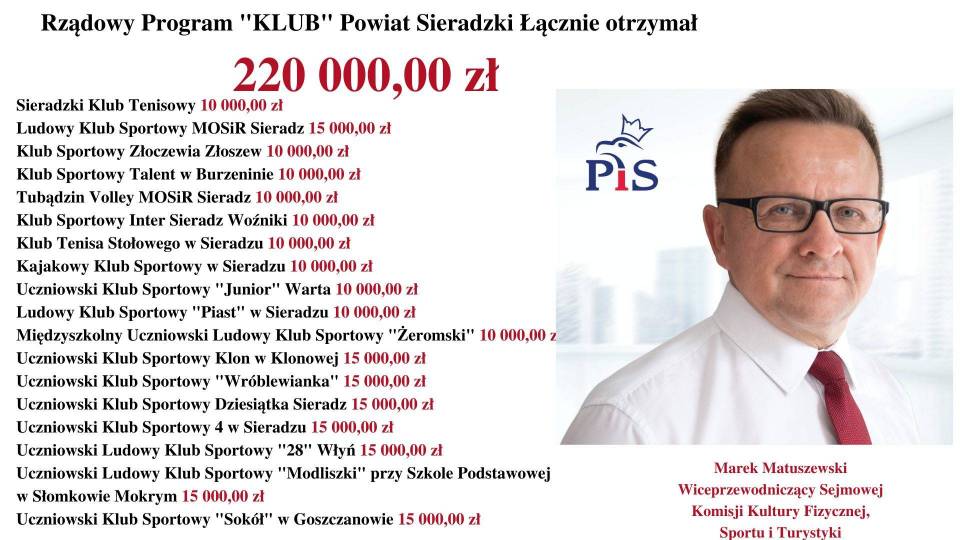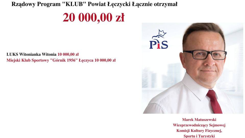 - Rządowy Program „KLUB" skierowany jest do dzieci i młodzieży do 18. roku życia. Rząd Prawa i Sprawiedliwości dba o prawidłową kondycję sportową i fizyczną młodzieży - mówi Poseł na Sejm RP, Marek Matuszewski. - Jest mi niezmiernie miło poinformować, że wśród tak dużej liczby beneficjentów, dofinansowanych przez Rząd Prawa i Sprawiedliwości (MSiT) znalazły się również kluby z województwa łódzkiego.