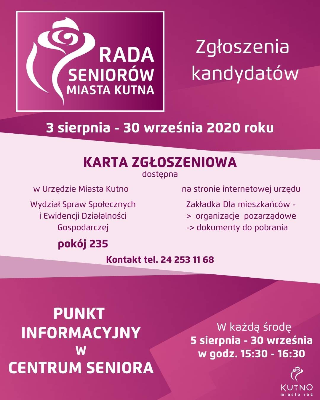 Zbliża się termin zgłaszania kandydatów na członków Rady Seniorów Miasta Kutno. Zgłoszeń możecie Państwo dokonywać w terminie od 3 sierpnia 2020 r. do 30 września 2020 r.