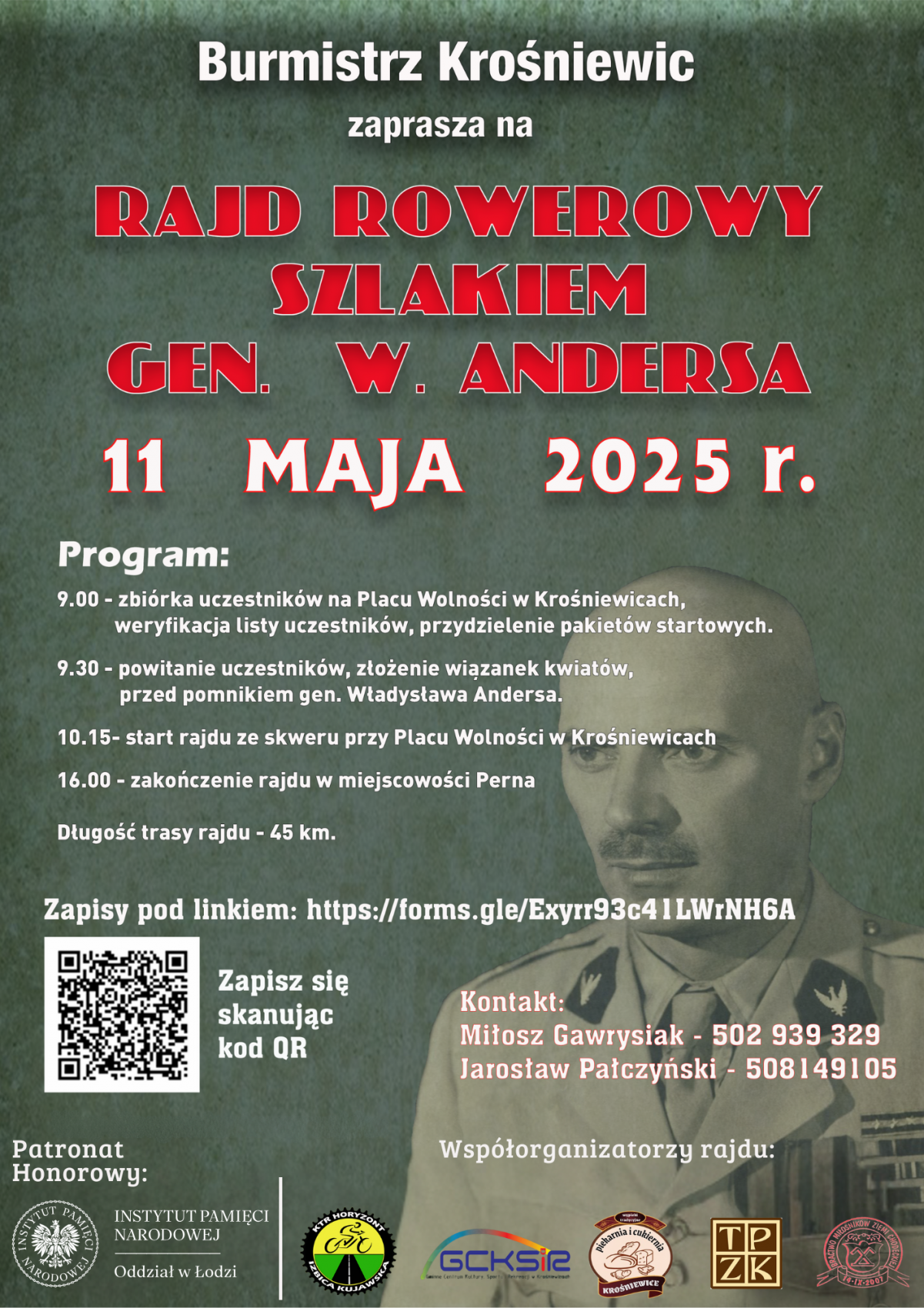 Spotkajmy się na starcie – Krośniewice, 11 maja 2025Burmistrz Krośniewic zaprasza wszystkich miłośników dwóch kółek i historii na Rajd Rowerowy Szlakiem generała Władysława Andersa. To wyjątkowa okazja, by w aktywny sposób uczcić pamięć legendarnego dowódcy oraz odkryć piękno regionu podczas wspólnej, 45-kilometrowej wyprawy przez malownicze tereny.