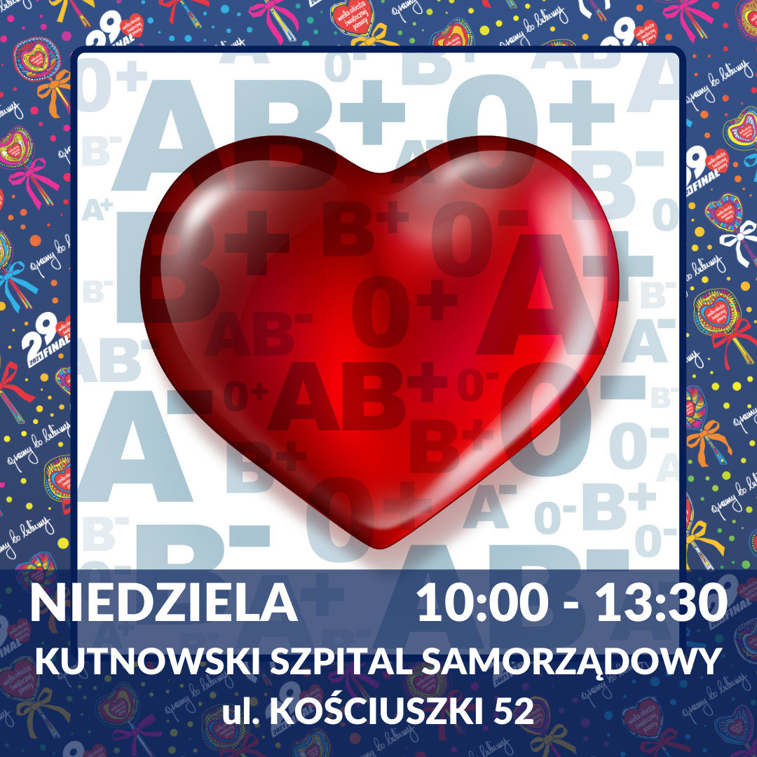 Pobór krwi stał się nieodłącznym elementem Wielkiej Orkiestry Świątecznej Pomocy i nie inaczej będzie w tym roku. Punkt pobrań będzie dostępny w godz. 10:00 - 13:30 w Kutnowskim Szpitalu Samorządowym, przy ul. Kościuszki 52.