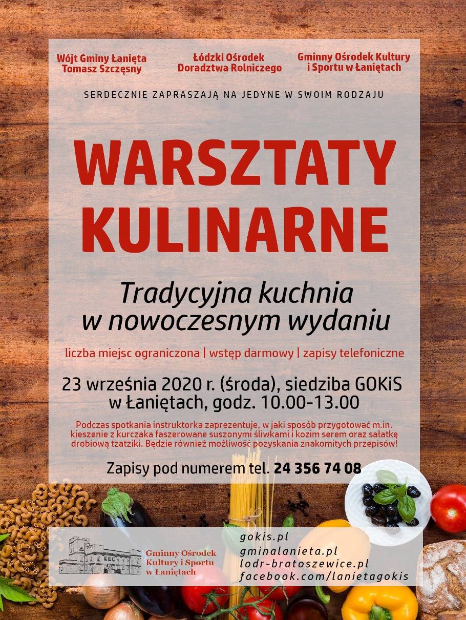 Wójt Gminy Łanięta Tomasz Szczęsny, Łódzki Ośrodek Doradztwa Rolniczego oraz GOKiS Łanięta zapraszają na otwarte warsztaty kulinarne "Tradycyjna kuchnia w nowoczesnym wydaniu".