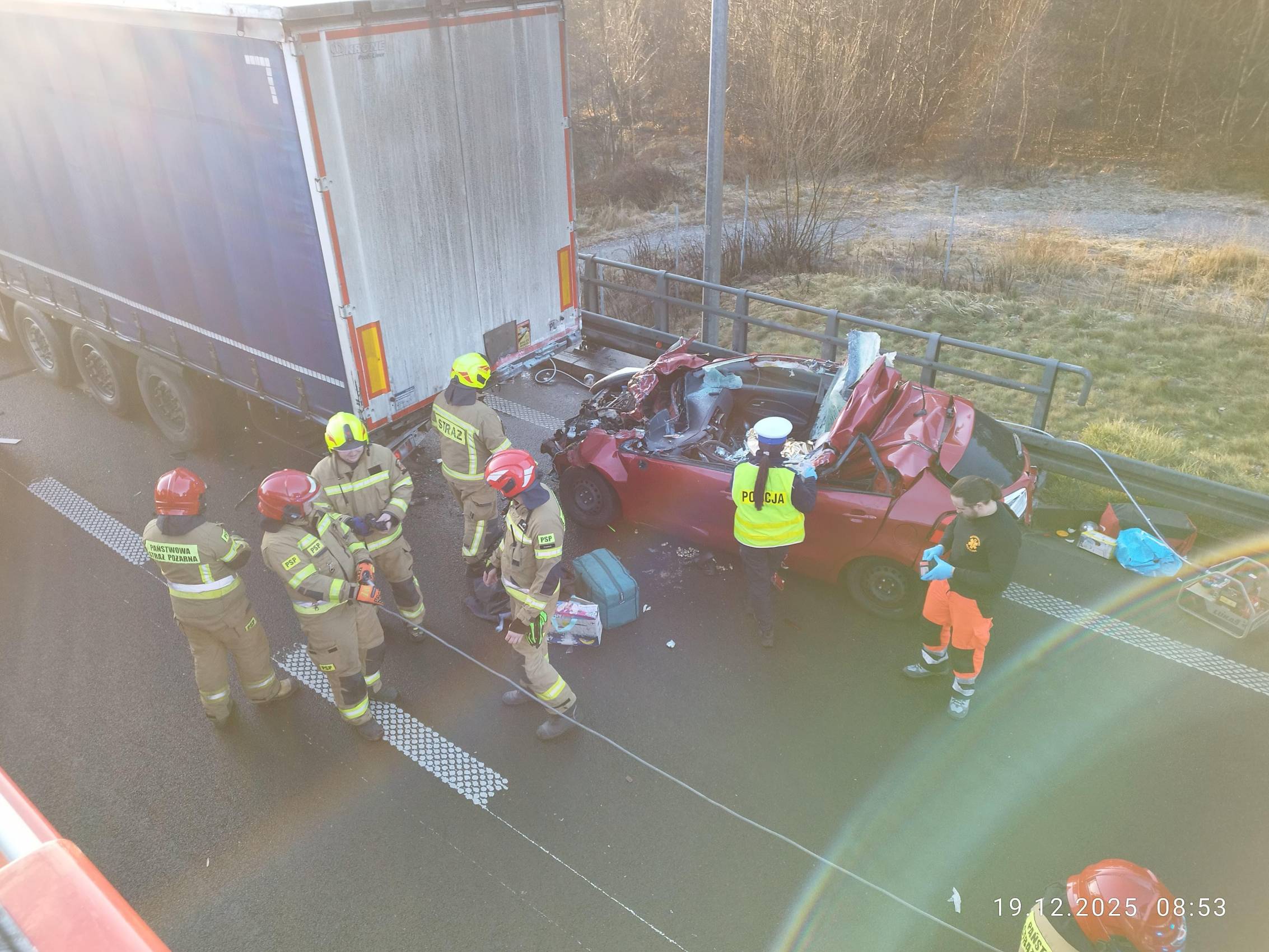 Do zdarzenia doszło po godzinie 8.00 na 349. kilometrze autostrady. Samochód osobowy najechał na tył pojazdu ciężarowego, wbijając się pod jego naczepę. Na miejsce natychmiast skierowano służby ratunkowe. Strażacy musieli użyć specjalistycznego sprzętu, aby wydobyć kierowcę z rozbitego auta.