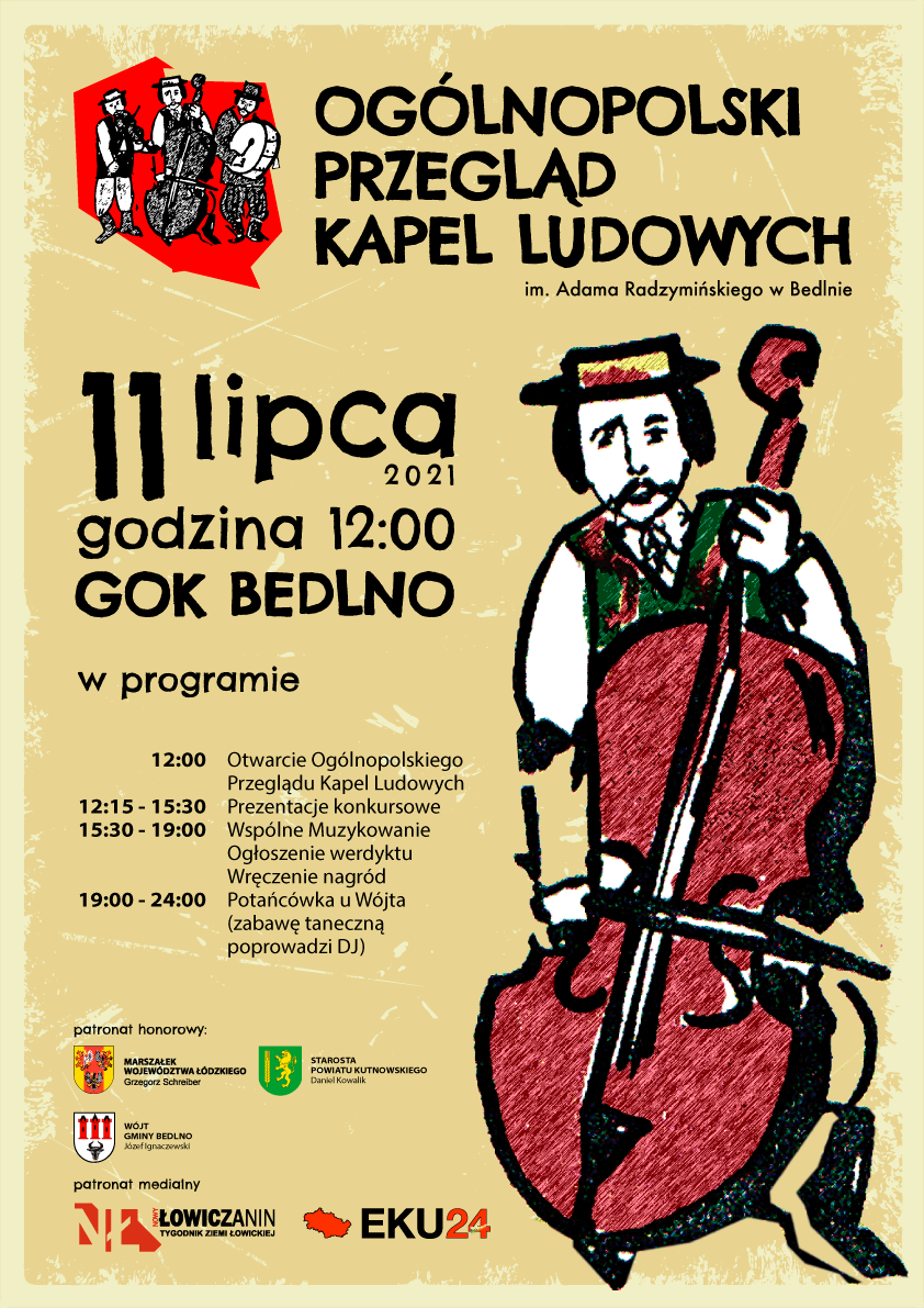 W niedzielę, 11 lipca od godz. 12.00 odbędzie się kolejna edycja Ogólnopolskiego Przeglądu Kapel Ludowych im. Adama Radzymińskiego - BEDLNO 2021.