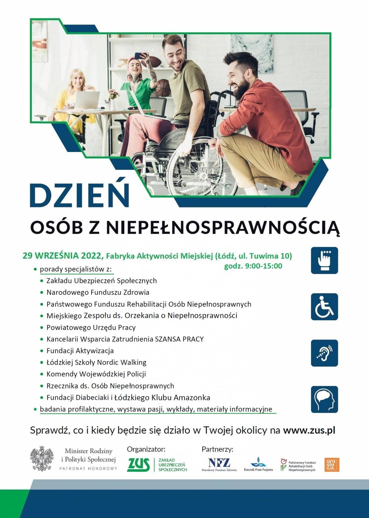W ramach Dni Osób z Niepełnosprawnością pod hasłem „Praca i pasja", ZUS I Oddział w Łodzi, przygotował 29 września 2022 r., w godzinach od 10:00 do 15:00, szereg atrakcji dla osób z niepełnosprawnością. Zapraszamy w tym dniu do Fabryki Miejskiej Aktywności w Łodzi, przy ul. Tuwima 10.